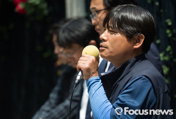 (서울=포커스뉴스) 엄기한(왼쪽) 전국금속노조 유성기업지회 대외협력부장이 23일 오전 서울 종로구 서울지방경찰청 앞에서 현대자동차 양재동 사옥 앞 집회에 대한 경찰의 위법한 공권력 행사 규탄 기자회견 중 모두발언 하고 있다.