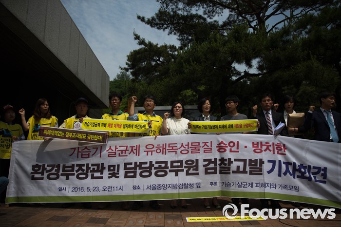 (서울=포커스뉴스) 23일 오전 서울 서초구 서울중앙지검 앞에서 가습기 살균제 피해자와 가족모임 관계자들이 기자회견을 열고 유해독성물질을 승인‧방치한 국가를 상대로 법정소송에 돌입할 것을 밝히고 있다. 피고발인은 강현욱·김명자 전 환경부 장관과 가습기 살균제 성분들이 승인될 당시 환경부 환경보건관리과 국장·과장 등 실무진 6명 이다.