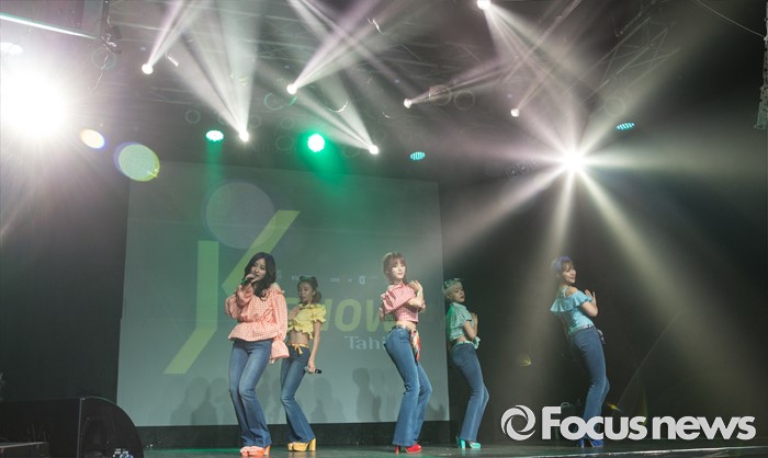 (서울=포커스뉴스) 23일 오전 서울 마포구 하나투어 브이홀에서 열린 걸그룹 타히티의 '알쏭달쏭' 쇼케이스에 참여한 멤버들이 무대를 선보이고 있다.