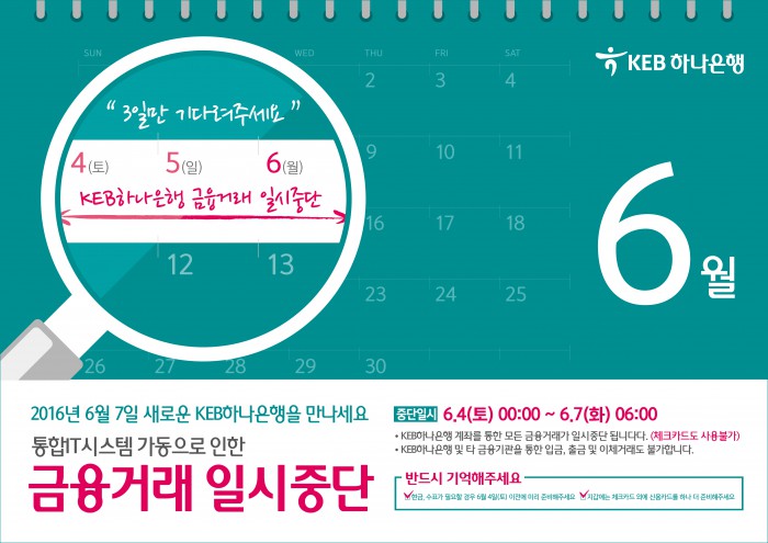 23일 KEB하나은행은 6월 4일 자정부터 7일 오전 6시까지 하나은행과 외환은행의 IT시스템 통합작업으로 인해 대부분의 금융거래가 일시 중단된다고 밝혔다.