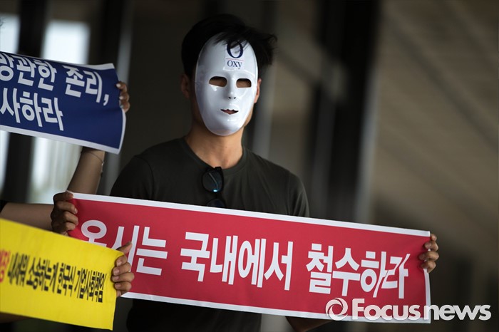 (서울=포커스뉴스) 23일 오전 서울 서초구 서울 중앙지검 앞에서 살균제 피해자와 가족모임 관계자들이 존 리 옥시 레킷벤키저 전 대표 검찰 소환조사를 기다리며 손 피켓을 들고 있다.