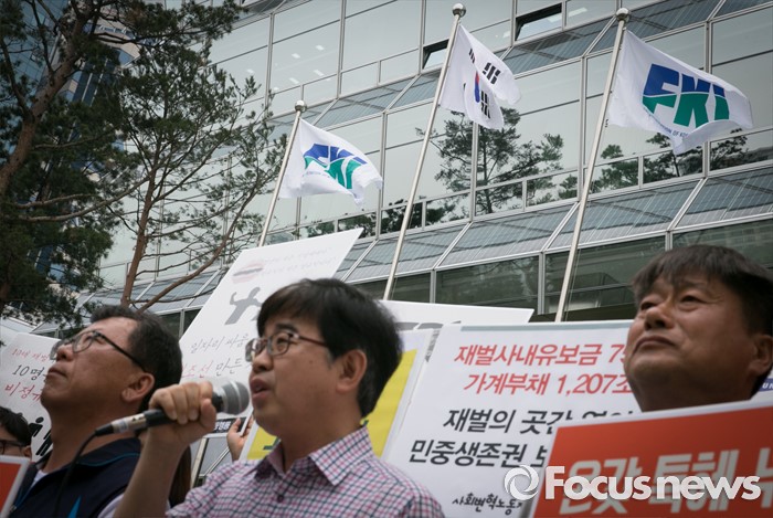 (서울=포커스뉴스) 23일 오전 서울 여의도 전국경제인연합회 앞에서 민주노총과 시민사회단체 등으로 구성된 재벌책임공동행동이 전경련 규탄 및 서울대행진 출발 기자회견을 하고 있다.