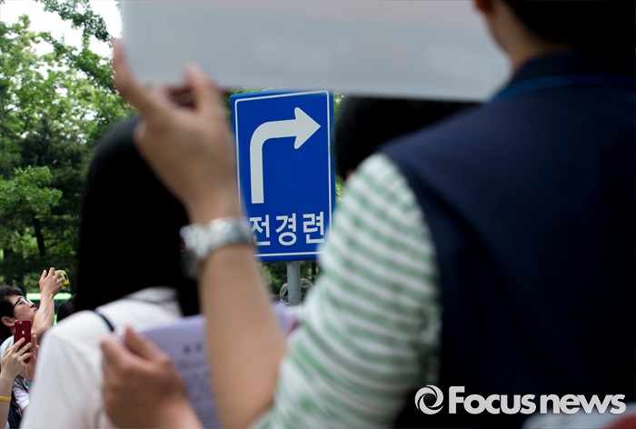 (서울=포커스뉴스) 23일 오전 서울 여의도 전국경제인연합회 앞에서 민주노총과 시민사회단체 등으로 구성된 재벌책임공동행동이 전경련 규탄 및 서울대행진 출발 기자회견을 하고 있다.