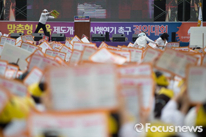 (서울=포커스뉴스) 23일 오후 서울 중구 시청광장에서 보육관계자들이 '어린이집 0~2세 맞춤형 보육제도 개선 및 시행 연기'를 촉구하며 결의대회를 하고 있다.