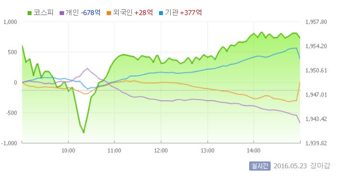 23일 코스피지수는 전거래일 대비 0.39%(7.58포인트) 오른 1955.25에 장을 마쳤다. 코스닥지수는 전거래일보다 0.89%(6.08포인트) 상승한 691.00에 마감했다.