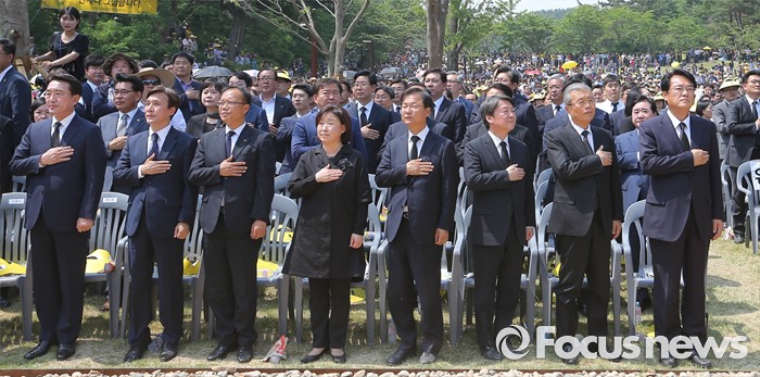 (김해=포커스뉴스) 23일 오후 경남 김해 봉하마을에서 엄수된 故 노무현 전 대통령 서거 7주기 추도식에 참석한 내빈들이 국기에 대한 경례를 하고 있다. 앞줄 왼쪽부터 현기환 청와대 정무수석, 김민석 민주당 대표, 나경채 정의당 공동대표, 심상정 상임대표, 천정배 국민의당 공동대표, 안철수 상임공동대표, 김종인 더불어민주당 비대위 대표, 정진석 새누리당 원내대표.