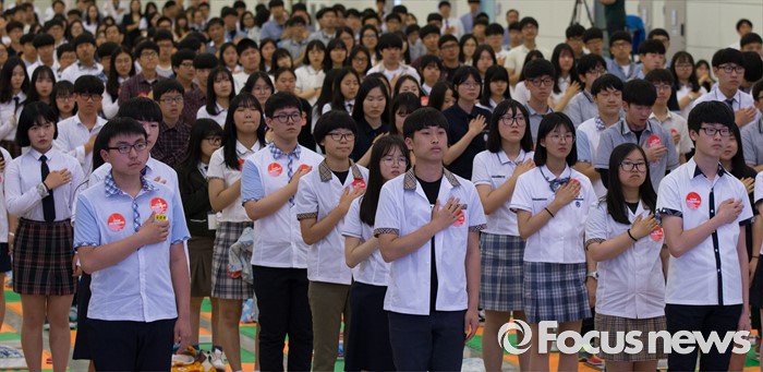 (세종=포커스뉴스) 23일 오후 세종시 정부세종컨벤션센터에서 민주평화통일자문회의 주최로 열린 2016 민주평통 통일골든벨 세종·충남대회에 참가한 학생들이 국기에 대한 경례를 하고 있다.