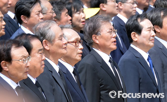 (김해=포커스뉴스) 23일 오후 경남 김해 봉하마을에서 엄수된 故 노무현 전 대통령 서거 7주기 추도식에 참석한 내빈들이 임을 위한 행진곡을 부르고 있다. 앞줄 왼쪽부터 이해찬 노무현재단 이사장, 문희상 더불어민주당 의원, 고영구 전 국정원장, 이병완 전 대통령 비서실장, 문재인 더불어민주당 전 대표, 정세균 의원.