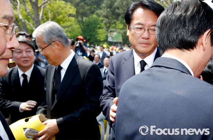 하지만 당시 정진석 새누리당 원내대표는 김종인 더불어민주당 비상대책위원회 대표, 안철수 국민의당 상임 공동대표 등과 함께 '임을 위한 행진곡'을 따라 부른 바 있다.(김해=포커스뉴스) 23일 오후 경남 김해 봉하마을에서 엄수된 故 노무현 전 대통령 서거 7주기 추도식에 참석한 정진석(오른쪽 두번째부터) 새누리당 원내대표와 김종인 더불어민주당 비대위 대표, 안철수 국민의당 상임공동대표가 각각 인사하고 있다. 2016.05.23 김흥구 기자