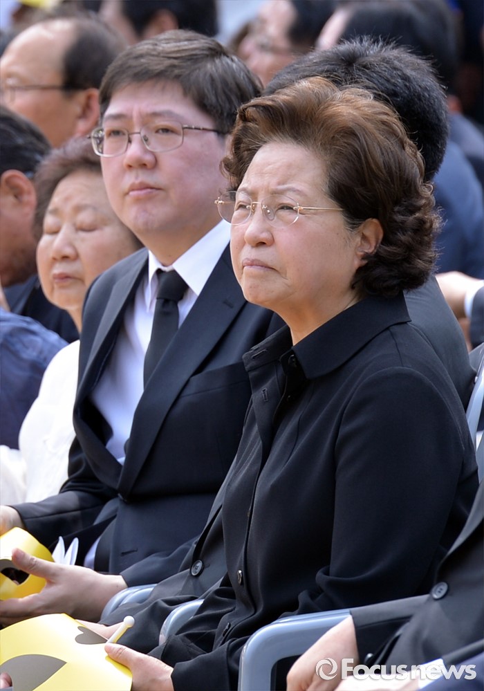 (김해=포커스뉴스) 23일 오후 경남 김해 봉하마을에서 엄수된 故 노무현 전 대통령 서거 7주기 추도식에 참석한 노 전 대통령 부인 권양숙(오른쪽) 여사와 김홍걸 더불어민주당 국민통합위원장이 추도식을 지켜보고 있다.