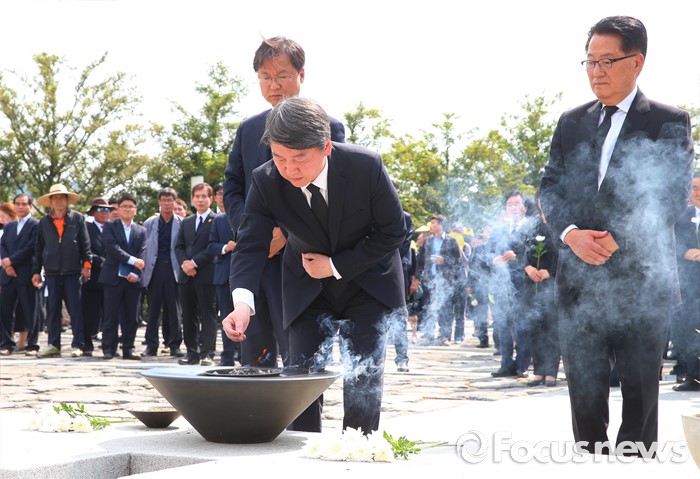 (김해=포커스뉴스) 23일 오후 경남 김해 봉하마을에서 엄수된 故 노무현 전 대통령 서거 7주기 추도식을 마친 뒤 안철수(가운데) 국민의당 상임공동대표, 천정배(왼쪽) 공동대표, 박지원 원내대표가 묘역 참배 및 헌화를 하고 있다.