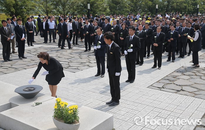 (김해=포커스뉴스) 23일 오후 경남 김해 봉하마을에서 엄수된 故 노무현 전 대통령 서거 7주기 추도식을 마친 뒤 노 전 대통령 부인 권양숙 여사와 장남 건호 씨 등 참석자들이 묘역 참배 및 헌화를 하고 있다.