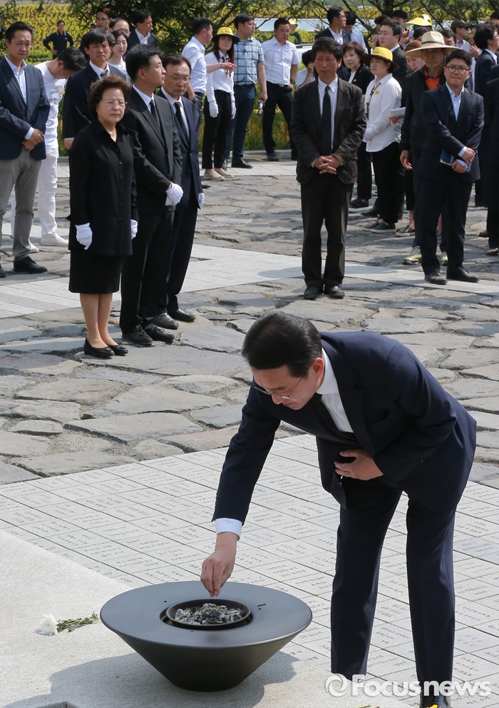 (김해=포커스뉴스) 23일 오후 경남 김해 봉하마을에서 엄수된 故 노무현 전 대통령 서거 7주기 추도식을 마친 뒤 현기환 청와대 정무수석이 묘역 참배 및 헌화를 하고 있다.