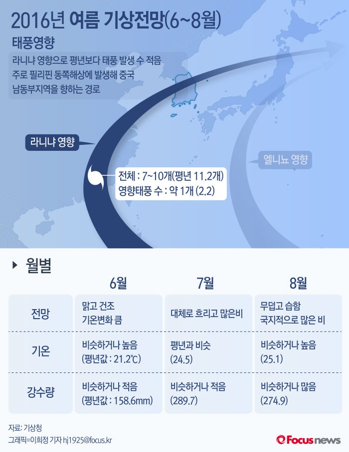 (서울=포커스뉴스) 23일 기상청이 발표한 '2016년 여름철 전망'에 따르면 올해 여름(6~8월)은 대체로 평년보다 더울 것으로 예상했다. 기온과 달리 강수량은 전년보다 줄어들겠으며 총 7~10개의 태풍이 발생하나 약 1개만 직접적인 영향줄 것으로 예보했다.