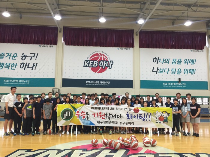 KEB하나은행 코칭스태프와 선수단은 20일 서울 청운동체육관에서 대구 정화중학교 농구동아리 학생 37명과 함께 구슬땀을 흘렸다. 1년에 1차례 하루종일 동아리 활동을 할 수 있는 동아리 전일제를 맞아 프로농구팀에 관심을 가진 농구동아리 학생들을 초청한 것이다.