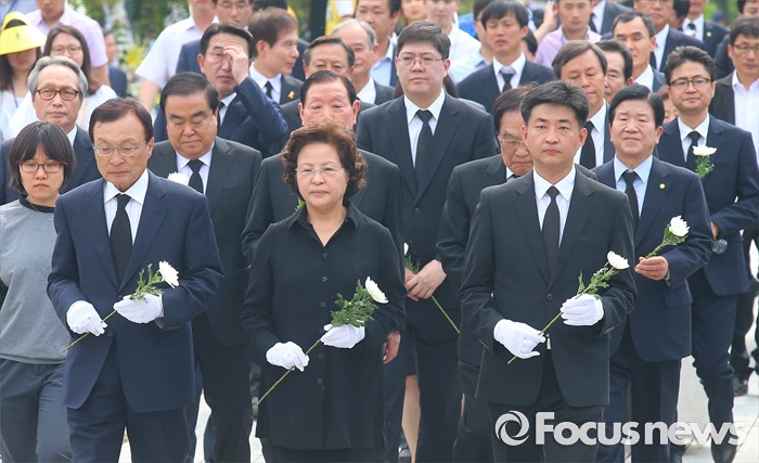 (김해=포커스뉴스) 23일 오후 경남 김해 봉하마을에서 엄수된 故 노무현 전 대통령 서거 7주기 추도식을 마친 뒤 노 전 대통령 부인 권양숙 여사와 장남 건호 씨 등 참석자들이 묘역 참배 및 헌화를 하고 있다.