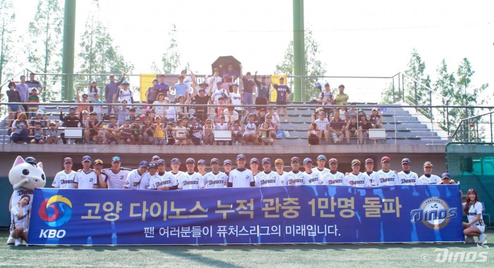 고양 다이노스는 지난해 경기도 고양시로 이전했고, 퓨처스리그 최초로 주말 및 공휴일 홈경기를 유료화했다. '우리 동네 야구단'을 목표로 다양한 프로모션을 펼치며 홈팬들을 야구장으로 이끌었다. 지난해 17경기에서 1차례 매진(1000석)되는 등 평균 400여명 관중이 함께했다. 28경기째 누적관중 1만명 기록을 세우게 됐다.