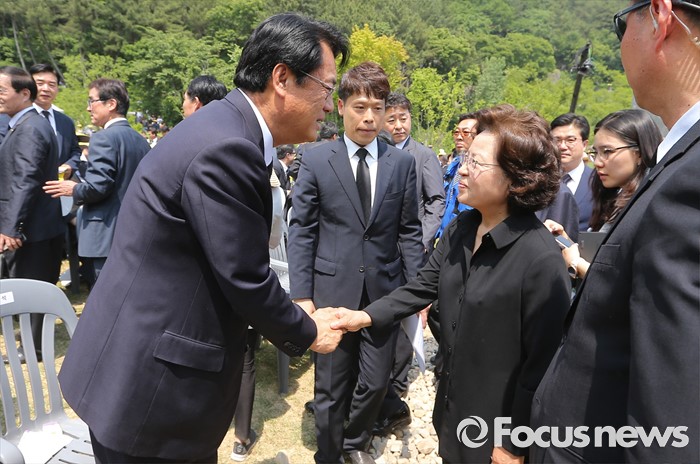 (김해=포커스뉴스) 23일 오후 경남 김해 봉하마을에서 엄수된 故 노무현 전 대통령 서거 7주기 추도식에 참석한 노 전 대통령 부인 권양숙(오른쪽) 여사와 정진석 새누리당 원내대표가 인사하고 있다.