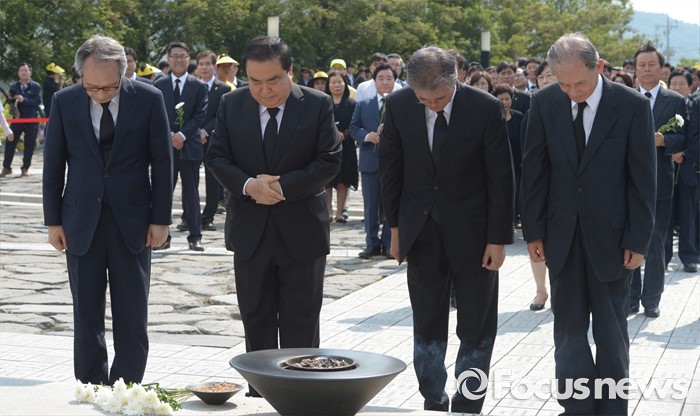 (김해=포커스뉴스) 23일 오후 경남 김해 봉하마을에서 엄수된 故 노무현 전 대통령 서거 7주기 추도식을 마친 뒤 이병완(왼쪽부터) 전 대통령 비서실장, 문희상 더불어민주당 의원, 문재인 전 대표, 고영구 전 국정원장 등이 묘역 참배 및 헌화를 하고 있다.