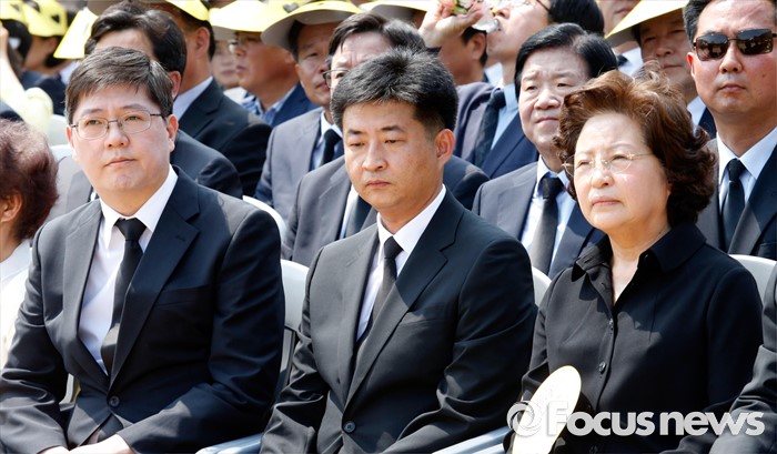 (김해=포커스뉴스) 23일 오후 경남 김해 봉하마을에서 엄수된 故 노무현 전 대통령 서거 7주기 추도식에 참석한 노 전 대통령 부인 권양숙(오른쪽부터) 여사, 장남 건호 씨, 김홍걸 더불어민주당 국민통합위원장이 자리하고 있다.