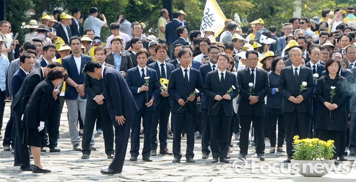 (김해=포커스뉴스) 23일 오후 경남 김해 봉하마을에서 엄수된 故 노무현 전 대통령 서거 7주기 추도식을 마친 뒤 정진석 새누리당 원내대표가 묘역 참배 및 헌화 후 노 전 대통령 부인 권양숙 여사와 인사를 하고 있다.