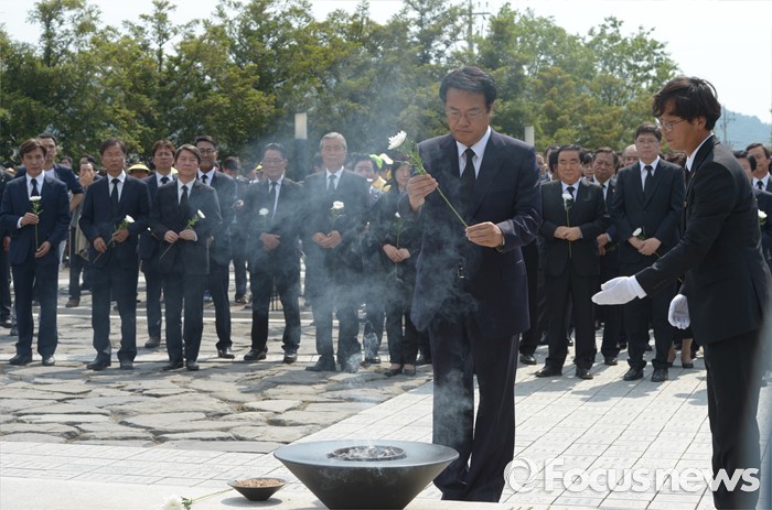 (김해=포커스뉴스) 23일 오후 경남 김해 봉하마을에서 엄수된 故 노무현 전 대통령 서거 7주기 추도식을 마친 뒤 정진석 새누리당 원내대표가 묘역 참배 및 헌화를 하고 있다.