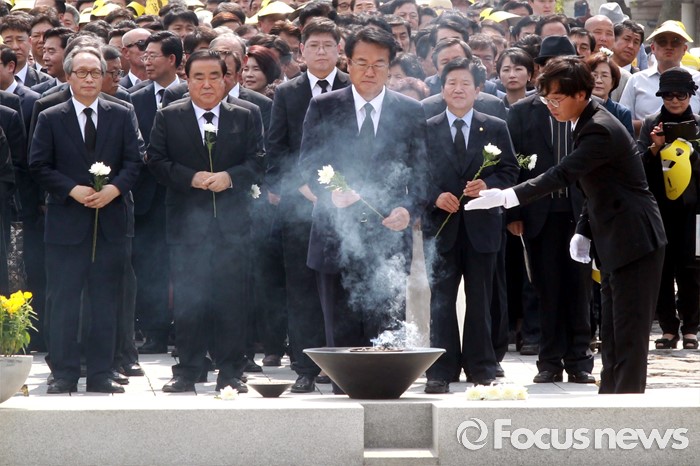(김해=포커스뉴스) 23일 오후 경남 김해 봉하마을에서 엄수된 故 노무현 전 대통령 서거 7주기 추도식을 마친 뒤 정진석 새누리당 원내대표가 묘역 참배 및 헌화를 하고 있다.