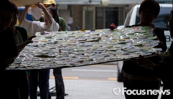 (서울=포커스뉴스) 23일 오후 서울 동작구 서울여성플라자 입구에서 서초구청 및 여성가족재단 직원들이 강남역 묻지마 살인 피해자 추모 기록물들을 전시공간으로 옮기고 있다.