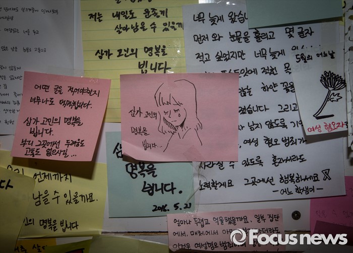 (서울=포커스뉴스) 23일 오후 서울 동작구 서울여성플라자 로비에 마련된 추모 전시장에 게시된 강남역 묻지마 살인 피해자 추모 기록물에 고인을 기리는 쪽지들이 붙어 있다.