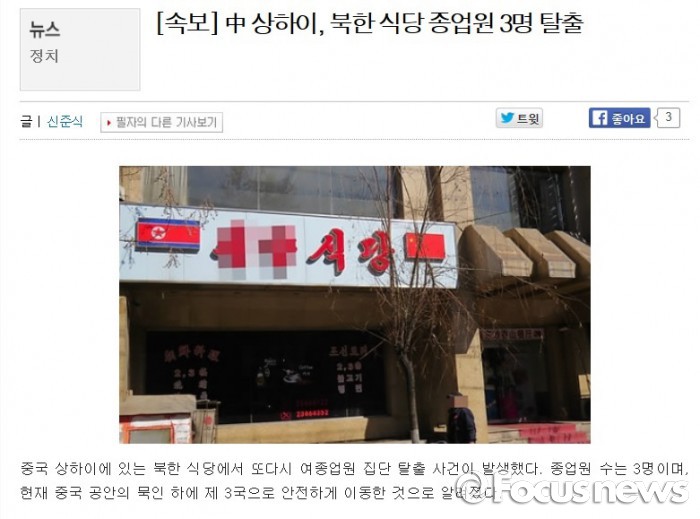 앞서 중국 닝보(寧波)에 소재한 류경식당에서 근무하던 북한 종업원 20명 중 13명이 집단 탈출해 4월7일 국내 입국한 바 있다. 북한은 이들이 납치됐다면서 송환하라고 줄기차게 주장하고 있다.북한 전문 온라인 매체인 뉴포커스는 23일 [속보]형식으로 "중국 상하이에 있는 북한 식당에서 또다시 종업원들이 집단탈출하는 사건이 발생했다"고 보도했다. <사진출처=뉴포커스 홈페이지>중국 닝보(寧波)에 소재한 류경식당에서 근무하던 북한 종업원 20명 중 13명이 집단 탈출해 4월7일 국내 입국했다. <사진출처=통일부>