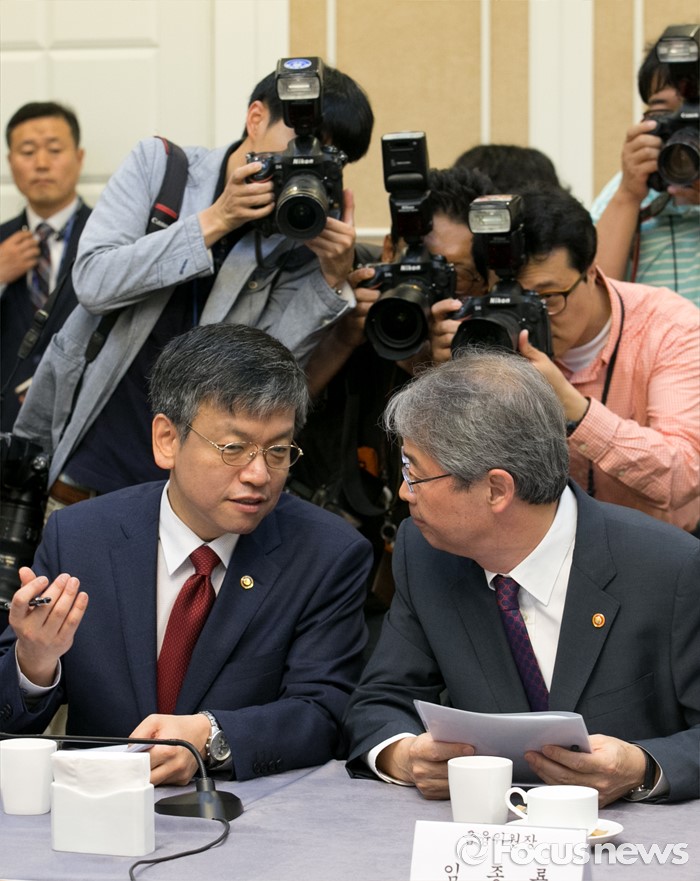 (서울=포커스뉴스) 24일 오전 서울 여의도 국회 귀빈식당에서 열린 조선·해운업 구조조정 관련 당정협의에 참석한 임종룡(오른쪽) 금융위원장과 최상목 기획재정부 1차관이 대화하고 있다.