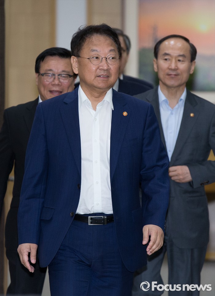 (세종=포커스뉴스) 유일호(맨 앞쪽) 경제부총리 겸 기획재정부장관이 24일 오전 세종시 정부세종청사 국무회의장에서 서울-세종 영상회의로 열린 국무회의에 입장하고 있다.