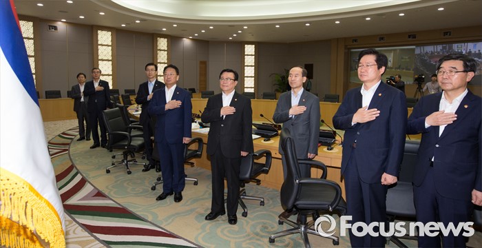 (세종=포커스뉴스) 유일호(왼쪽 네 번째) 경제부총리 겸 기획재정부장관과 국무위원들이 24일 오전 세종시 정부세종청사 국무회의장에서 서울-세종 영상회의로 열린 국무회의에 참석해 국기에 대한 경례를 하고 있다.
