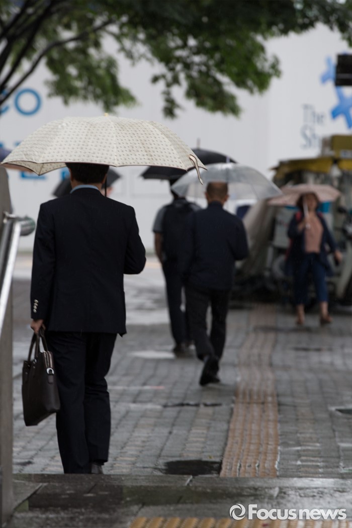 (서울=포커스뉴스) 전국이 흐리고 비가 내리는 24일 오전 서울 마포구 공덕역 인근 거리에서 시민들이 우산을 쓰고 지나가고 있다.