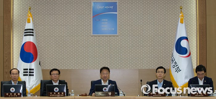 (세종=포커스뉴스) 유일호(가운데) 경제부총리 겸 기획재정부장관이 24일 오전 세종시 정부세종청사 국무회의장에서 서울-세종 영상회의로 열린 국무회의를 주재하고 있다.