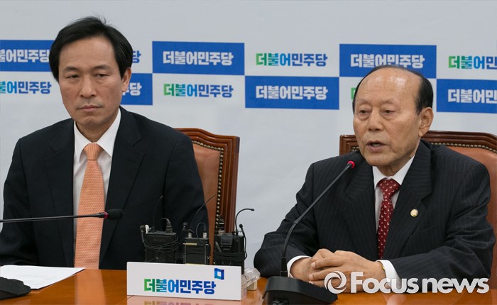 (서울=포커스뉴스) 이창복(오른쪽) 6·15 남측위원회 상임대표의장이 24일 오전 서울 여의도 국회에서 우상호 더불어민주당 원내대표와 면담에 앞서 인사말을 하고 있다.