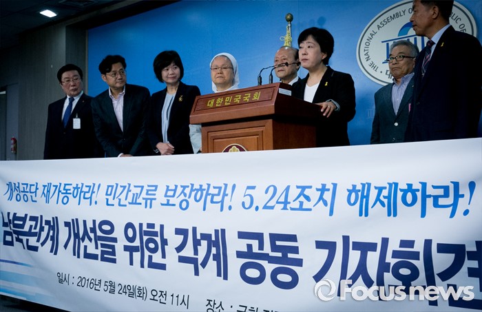 (서울=포커스뉴스) 24일 오전 서울 여의도 국회 정론관에서 홍익표 더불어민주당 의원, 이정미 정의당 당선인, 윤종오 무소속 당선인과 6·15 남측위원회 등 각계 종교 및 시민사회 대표들이 남북관계 개선을 위한 공동 기자회견을 하고 있다.