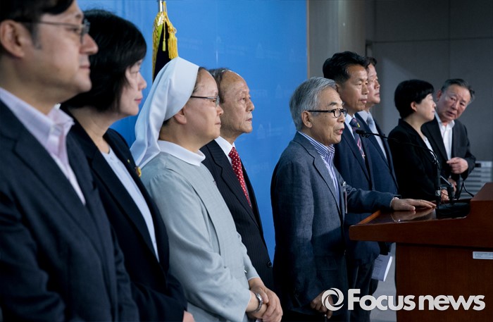 (서울=포커스뉴스) 24일 오전 서울 여의도 국회 정론관에서 홍익표 더불어민주당 의원, 이정미 정의당 당선인, 윤종오 무소속 당선인과 6·15 남측위원회 등 각계 종교 및 시민사회 대표들이 남북관계 개선을 위한 공동 기자회견을 하고 있다.