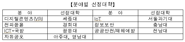 (서울=포커스뉴스) 미래창조과학부는 24일 올해 대학 ICT연구센터(8개) 및 그랜드 ICT연구센터(1개)로 최종 선정된 대학을 발표했다.이번에 선정된 대학 ICT연구센터는 경희대, 세종대, 전남대, 충남대, 서울과기대, 광운대, 아주대, 영남대 등 8개 대학과 그랜드 ICT연구센터로 선정된 부산대를 포함 총 9개 대학이다.