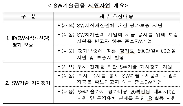 서석진 미래부 SW정책관은 “자산 추정이 어렵고 자본력이 미약한 SW스타트업·중소기업들이 지식재산권 및 기술 가치를 제대로 인정받고 사업화의 숨통을 마련할 수 있는 기회가 될 것”이라고 말했다.SW지식재산권 평가보증사업 개요.<표제공=미래부>