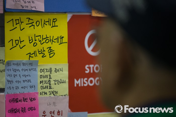 (서울=포커스뉴스) 강남역 인근 주점 화장실 살인사건 피해자 추모 공간이 옮겨진 서울시청 시민청에서 24일 오전 한 시민이 추모글귀를 살펴보고 있다.