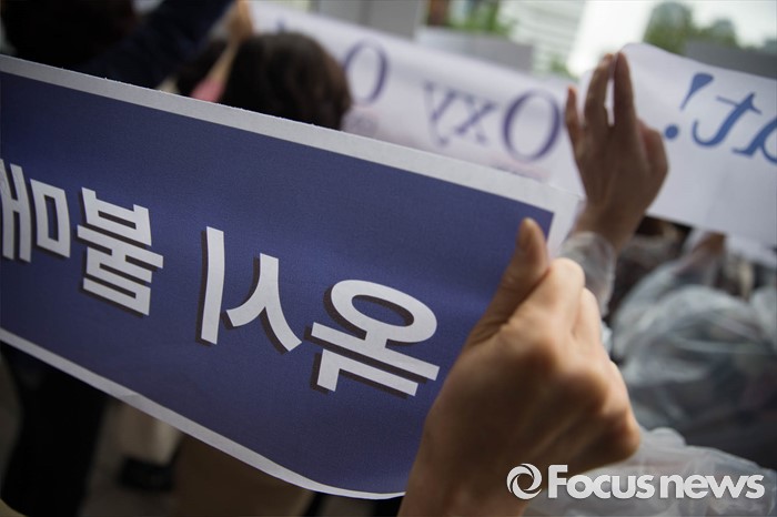 (서울=포커스뉴스) 24일 오후 서울 용산구 이마트 용산역점 앞에서 소비자단체들이 옥시 가습기 살균제 피해에 대한 사과와 보상, 옥시제품 유통업체에서 철수를 촉구하며 기자간담회를 갖고 있다.