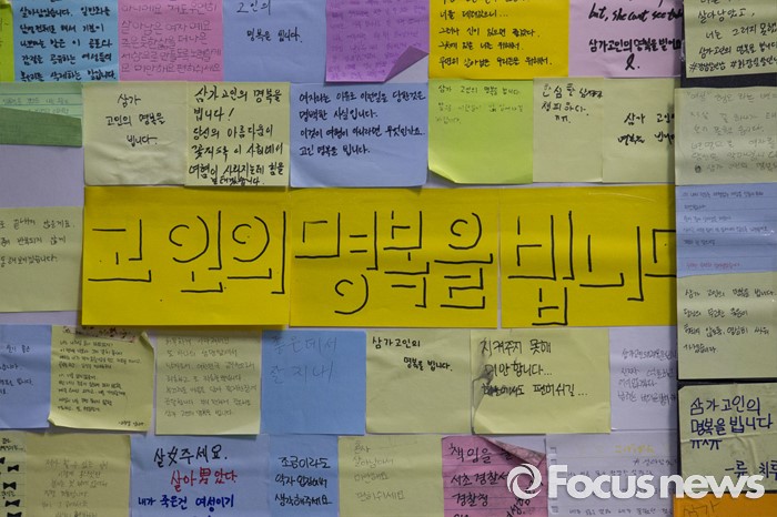 (서울=포커스뉴스) 24일 오전 강남역 인근 주점 화장실 살인사건 피해자 추모 공간이 옮겨진 서울시청 시민청에 추모 쪽지가 전시되어 있다.