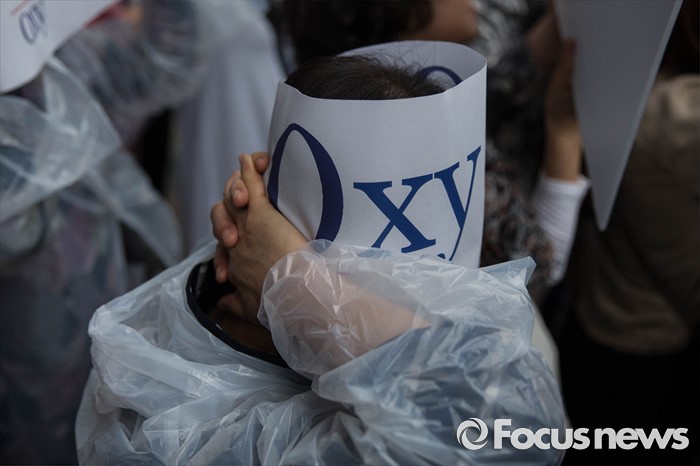 (서울=포커스뉴스) 24일 오후 서울 용산구 이마트 용산역점 앞에서 소비자단체들이 옥시 가습기 살균제 피해에 대한 사과와 보상, 옥시제품 유통업체에서 철수를 촉구하며 기자간담회를 갖고 있다.