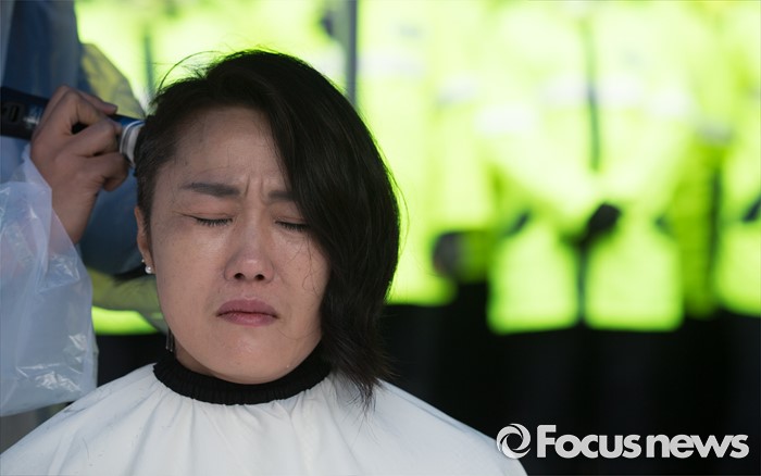 (서울=포커스뉴스) 24일 오전 서울 중구 서울시청 앞에서 열린 '서울시 발달장애인 부모 무기한 삭발결의 선포 기자회견'에 참석한 김남연 전국장애인부모연대 서울지부장이 삭발하고 있다.
