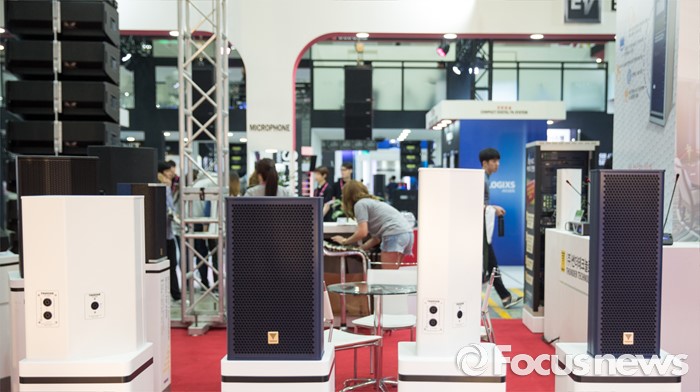 (서울=포커스뉴스) 24일 오전 서울 강남구 코엑스에서 열린 '제26회 국제 방송·음향·조명기기 전시회'의 한 부스에 전시된 스피커들.