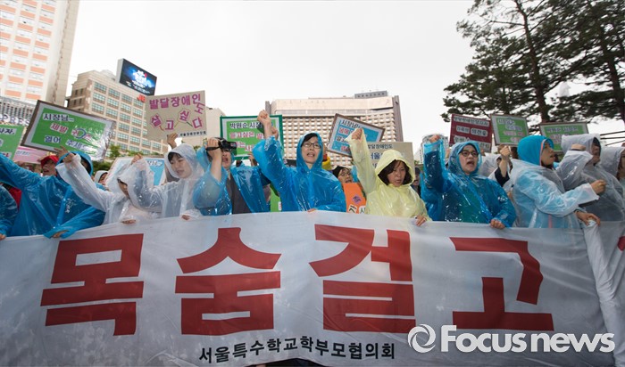 (서울=포커스뉴스) 24일 오전 서울 중구 서울시청 앞에서 열린 '서울시 발달장애인 부모 무기한 삭발결의 선포 기자회견'에 참석한 전국장애인부모연대 회원들이 구호를 외치고 있다.