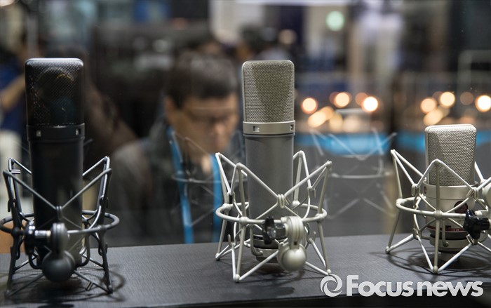 (서울=포커스뉴스) 24일 오전 서울 강남구 코엑스에서 열린 '제26회 국제 방송·음향·조명기기 전시회'를 찾은 한 관람객이 마이크를 바라보고 있다.