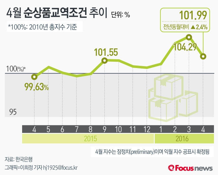 (서울=포커스뉴스) 24일 한국은행이 발표한 '4월 무역지수 및 교역조건'에 따르면 4월 순상품교역조건지수는 101.99로 전년 동월 대비 2.4% 상승했다.