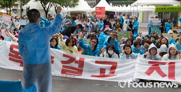 (서울=포커스뉴스) 24일 오전 서울 중구 서울시청 앞에서 열린 '서울시 발달장애인 부모 무기한 삭발결의 선포 기자회견'에 참석한 전국장애인부모연대 회원들이 삭발식 후 구호를 외치고 있다.
